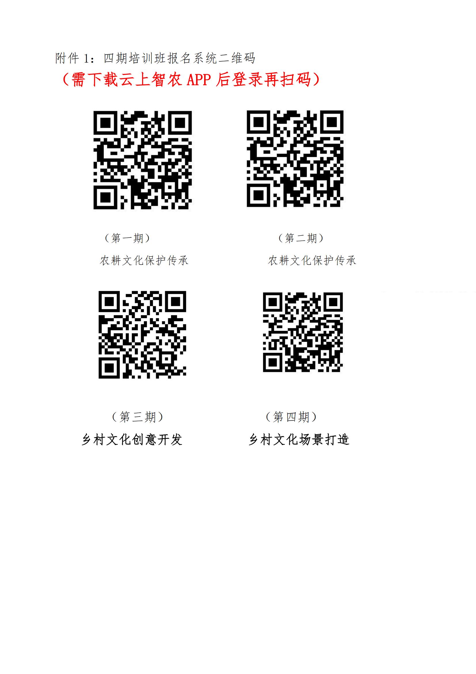2.报名方式:参训学员需下载“云上智农”APP,自主选择参训班次,并扫描每期班次对应的报名二维码,扫码填写相关信息进行报名。具体报名二维码如下(见附件1)。